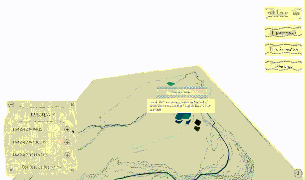 TRYSPACES es una investigación comparativa de incidencias de la organización transgresora en el espacio público de cuatro ciudades: Hanoi, París, Montreal y Ciudad de México. El Atlas Transgression es una plataforma web donde navegar y comprender las transformaciones que generan estas transgresiones del espacio urbano.