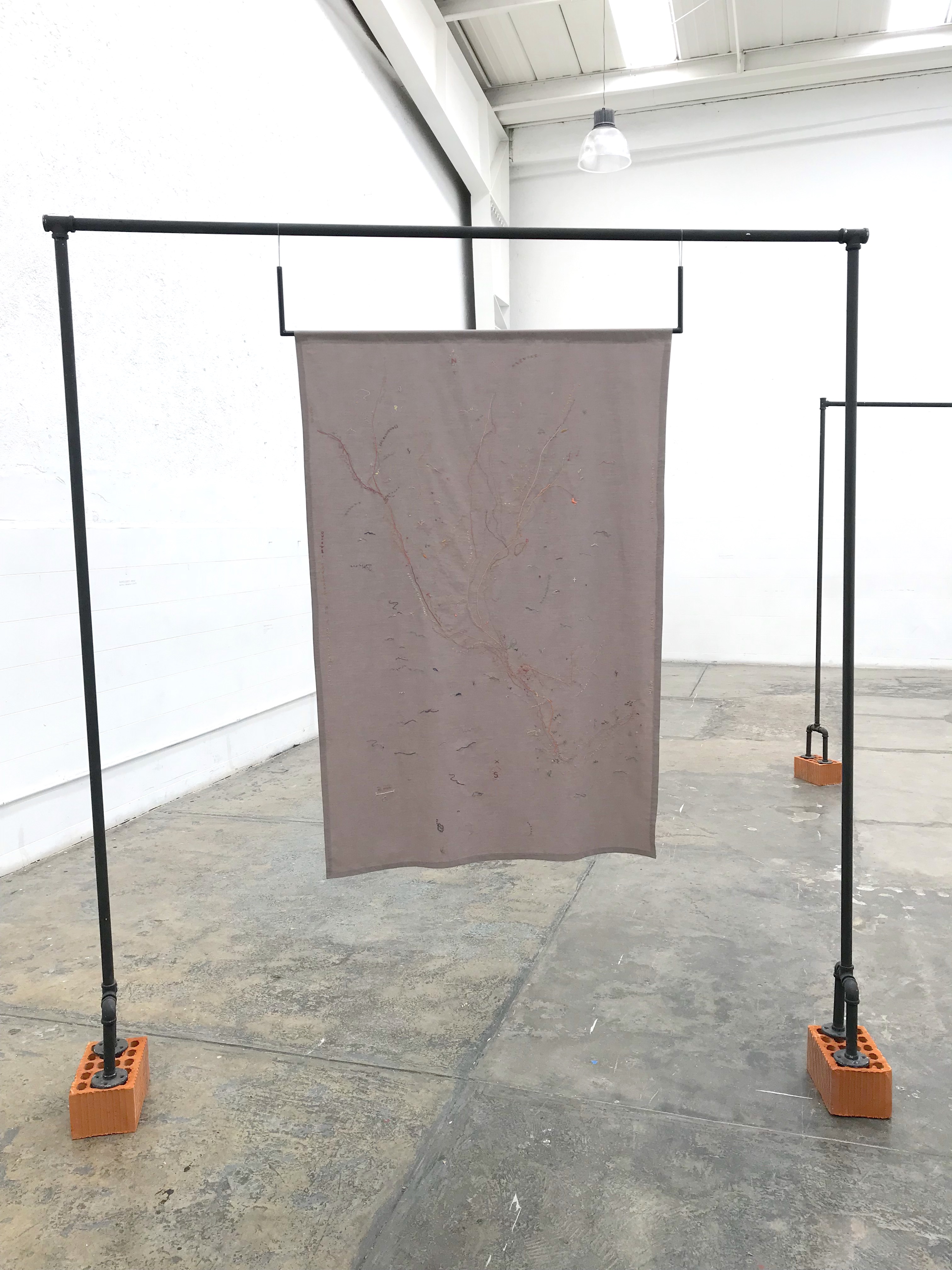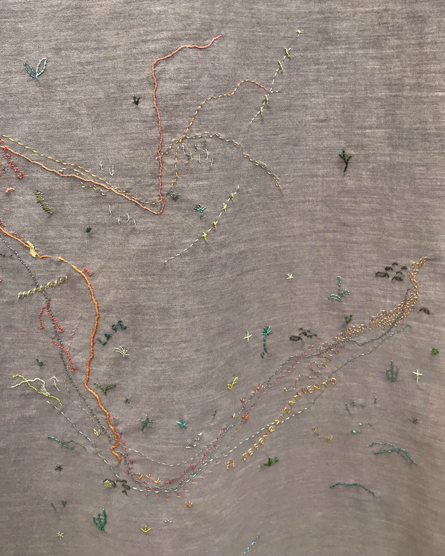 La pieza el derecho de caminar es un mapeo tanto estadístico como afectivo del flujo migratorio a pie desde San Pedro Sula (Honduras) hasta la frontera de México - Estados Unidos. A partir de entrevistas, lecturas y documentales, la artista recopiló conceptos que forman parte del proceso afectivo de la migración: el desenraizamiento, la fe, los protocolos de autocuidado, la desaparición. Al mismo tiempo, se pueden distinguir en el bordado las distintas rutas migrantes que más se recorren.