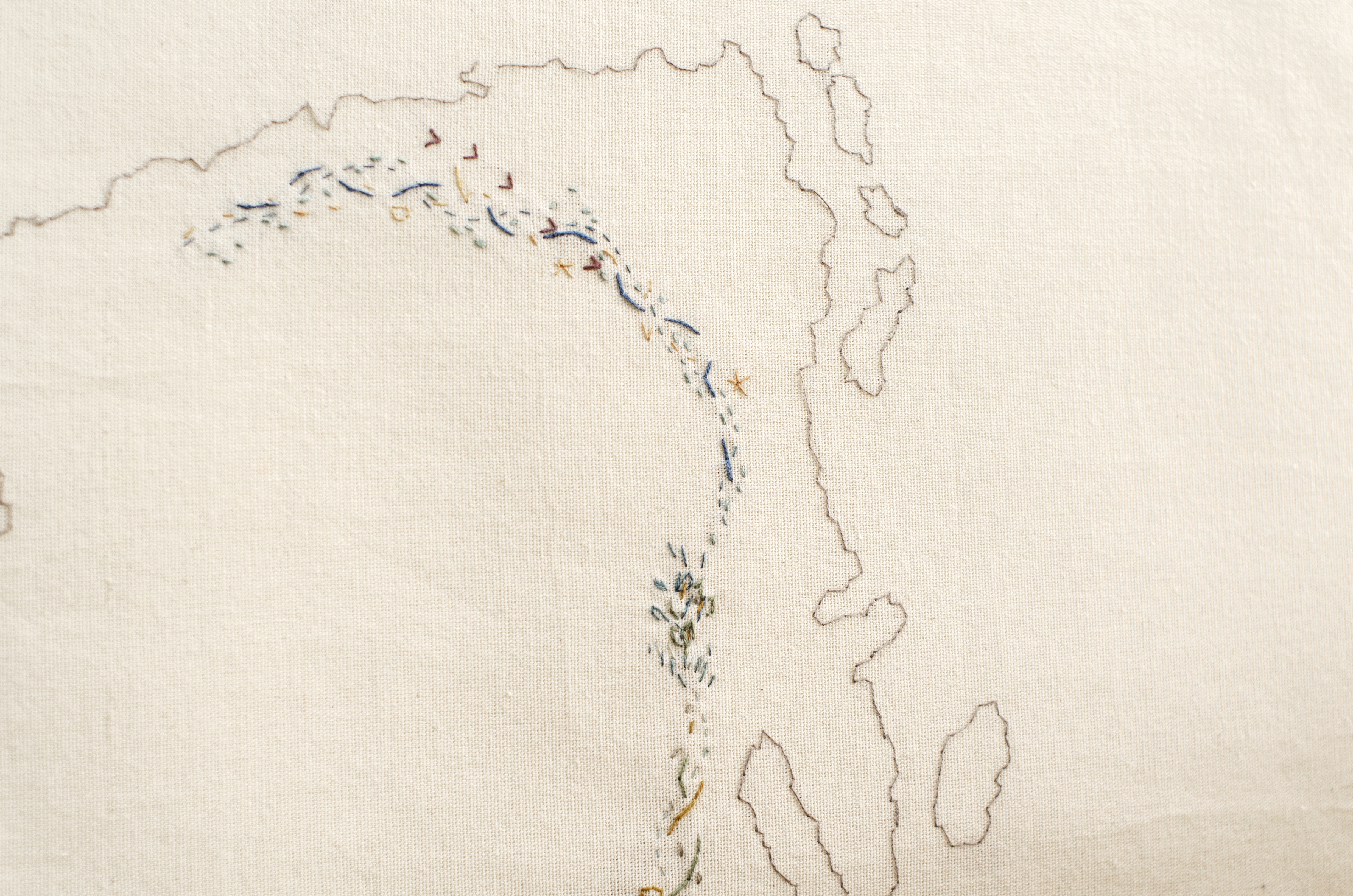 El textil es una herramienta tanto política como poética, desde su materialidad hasta su discurso. El textil remite a la memoria, al afecto, a lo táctil; campos desde los que podemos construir nuevas narrativas y acercamientos a los conflictos que nos rodean. A través de los mapas, al mismo tiempo que visibiliza las problemáticas actuales, se invita a los observadores a ser más amables, más compasivos y benevolentes con las personas y la naturaleza que nos rodean.